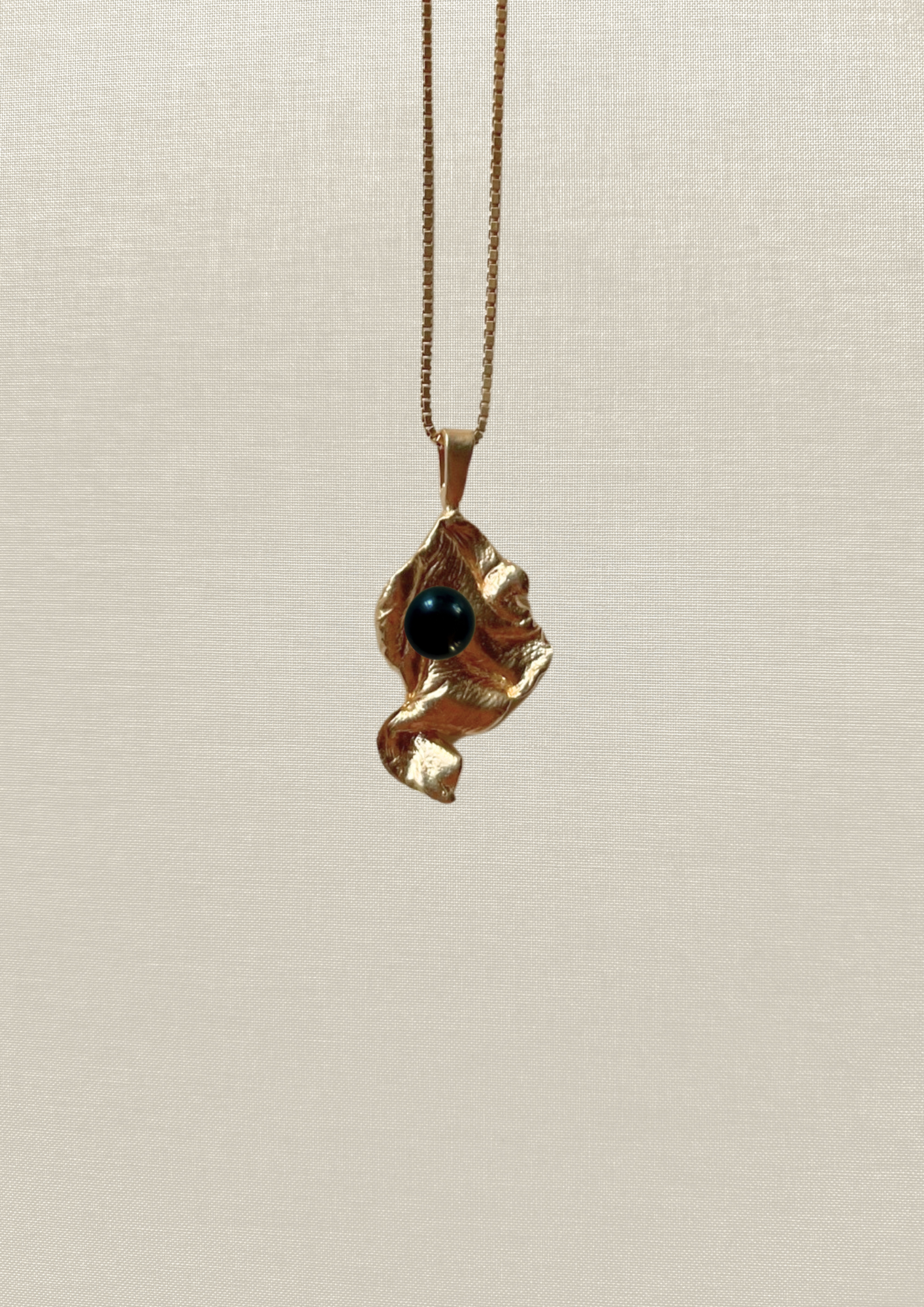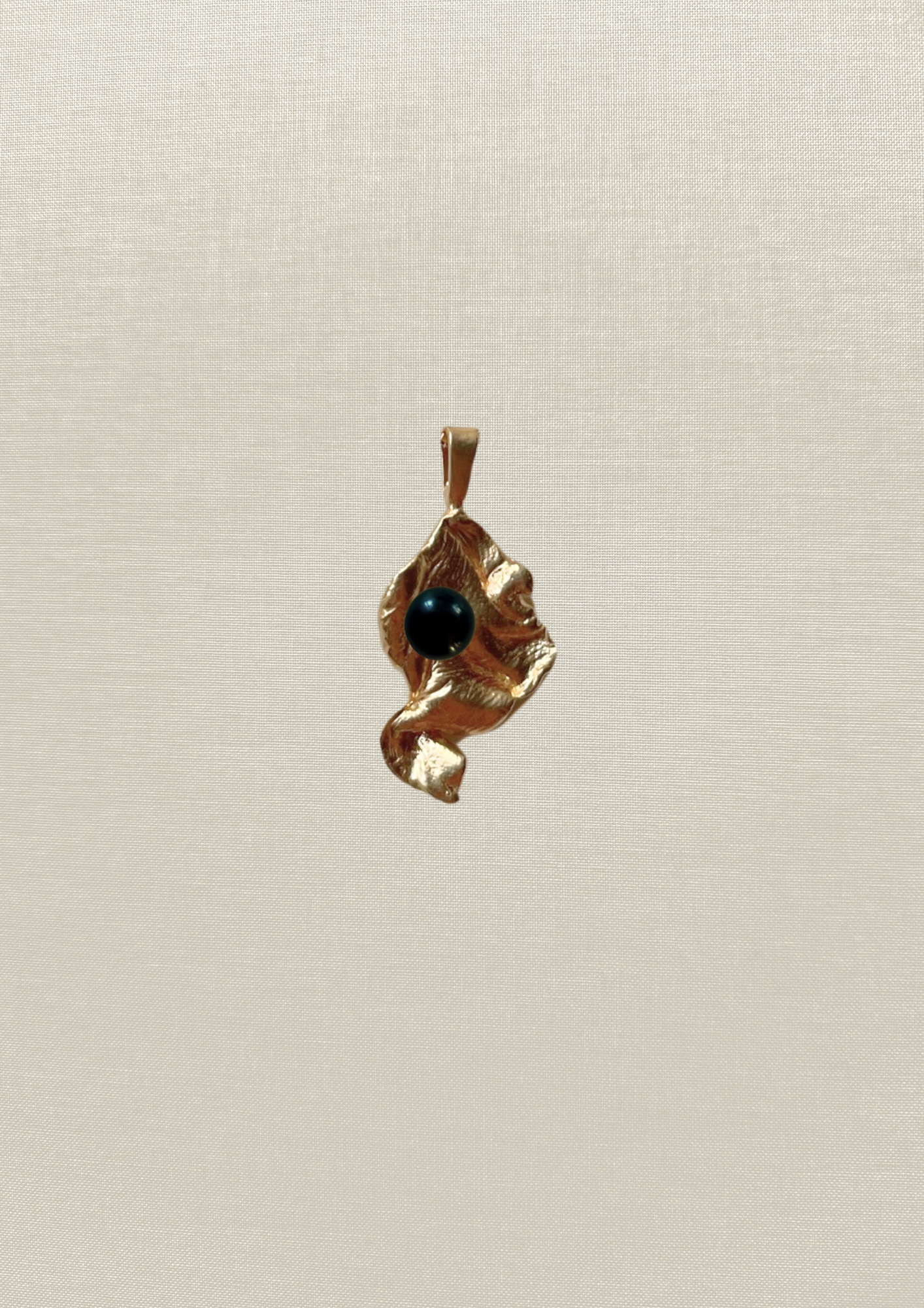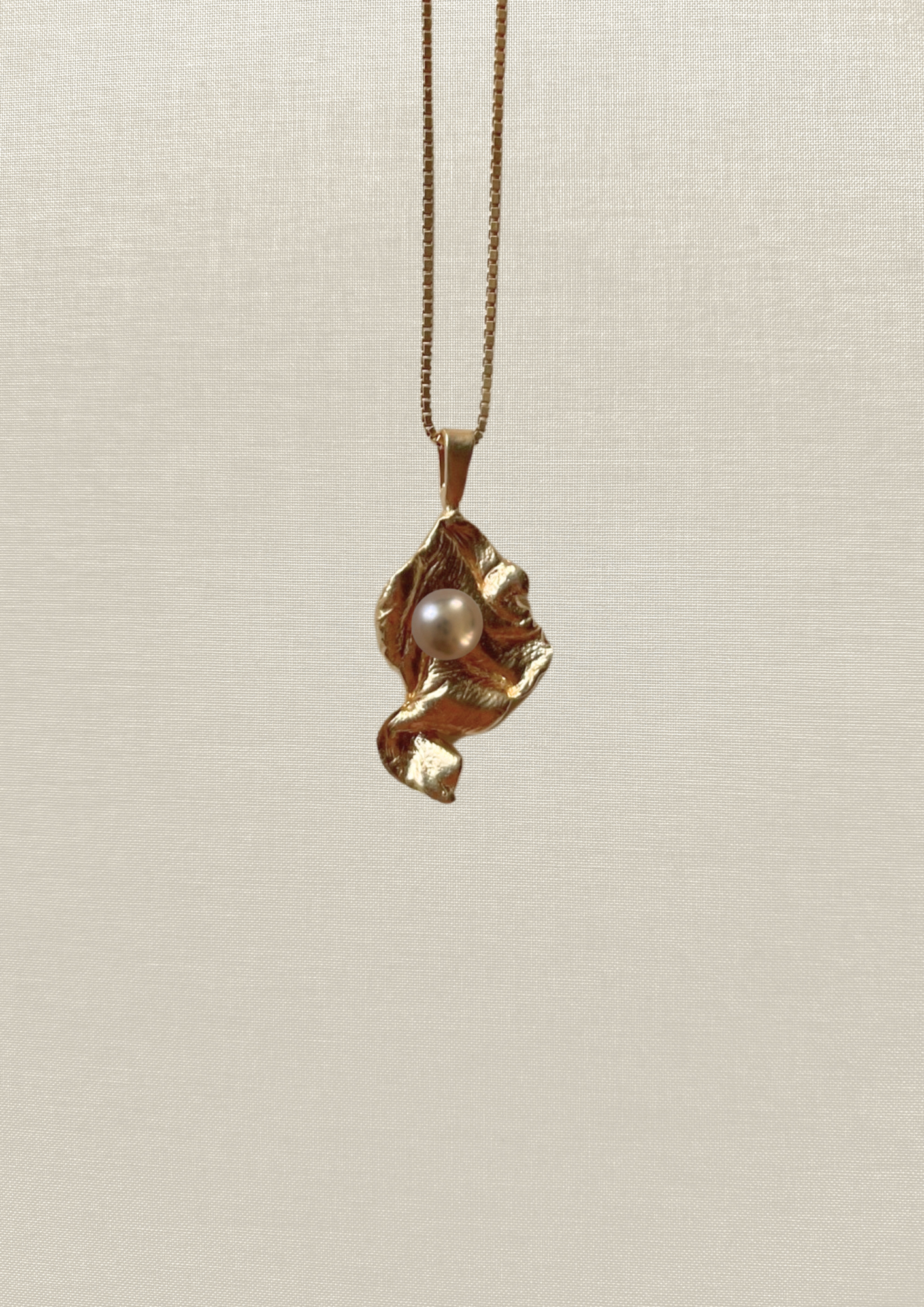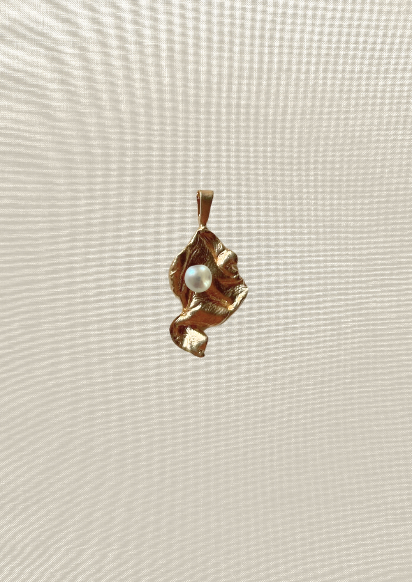 Et let og elegant vedhæng, i sin udefinerbare form og fine detaljer, tilføjer en subtil luksus. Vedhænget kan både vælges uden perle, eller med en ferskvandsperle i farverne hvid, lyserød og påfugl, hvilket giver dig mulighed for at personliggøre dit smykke.
